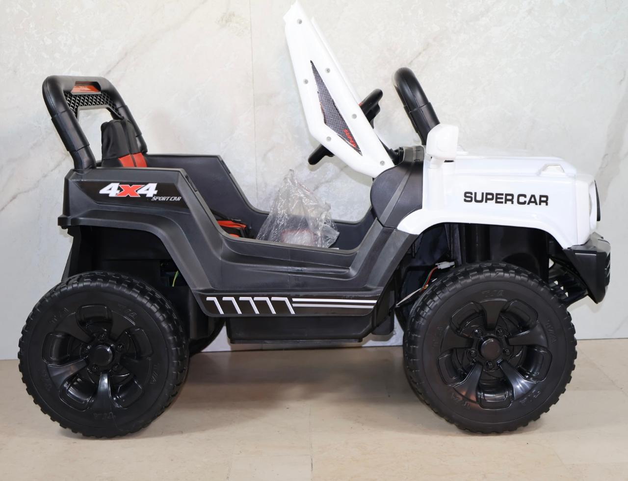 carro eléctrico con mando a control remoto, con opción de manejo manualmente, cuenta con suspencion y 3 motores localizados en las llantas traseras y uno independiente para la dirección, puertas abatibles, cojineria en cuerina, cinturón de seguridad, música incorporada, luces led, botón de marcha adelante, neutro y marcha atrás