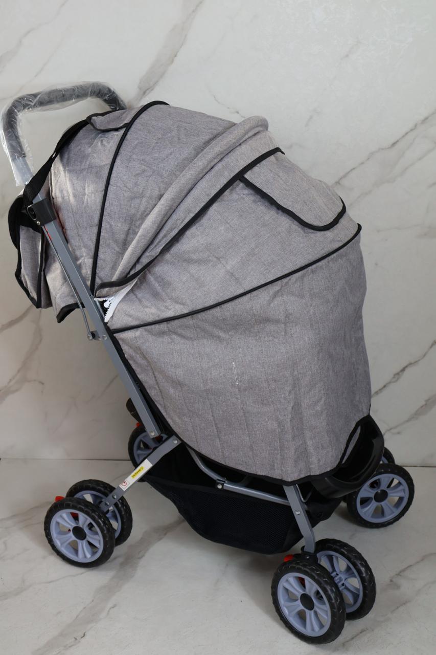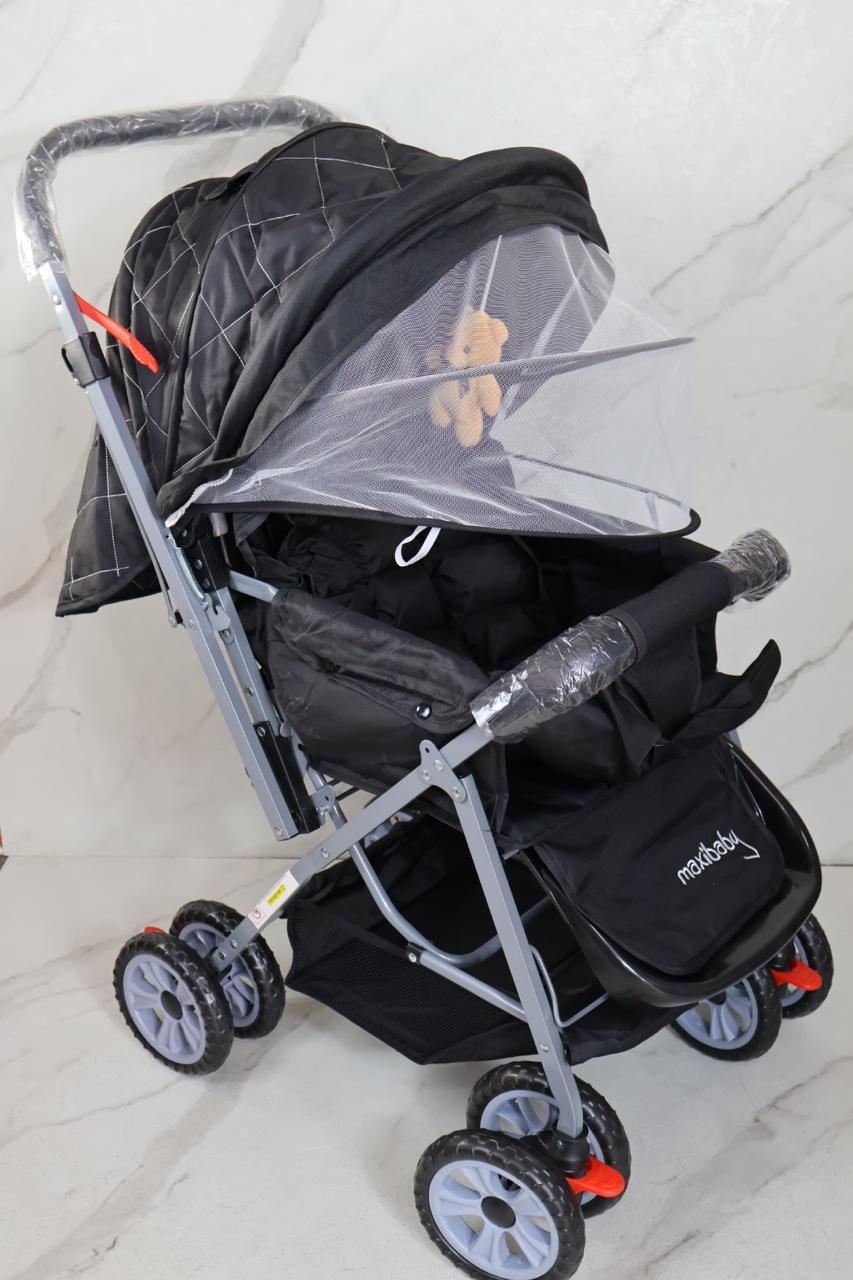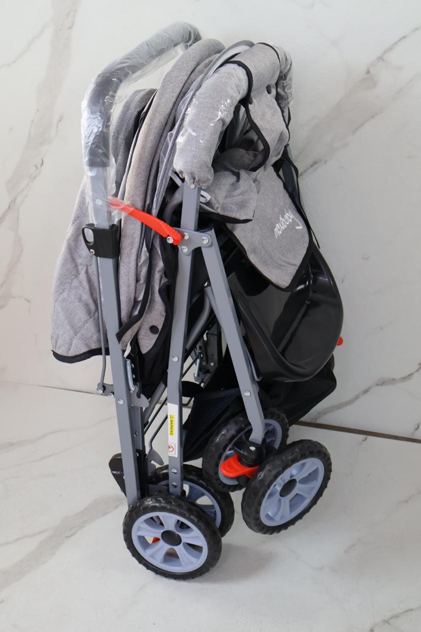 coche con estructura en barillas, talas en polieter, manija reversible, toldillo y muñeco musical, 3 punto ajustables en espaldar, y punto de seguridad en cadera, forro en tela que cubre un 100%, llanta doble en goma, incluye pañalera