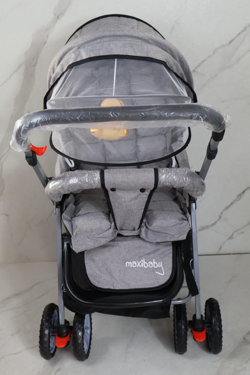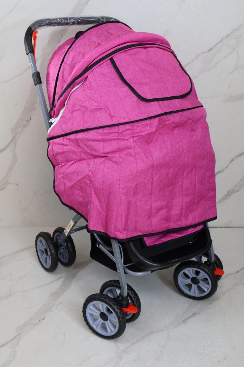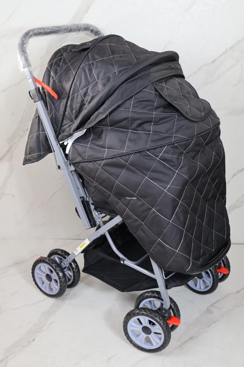 coche con estructura en barillas, talas en polieter, manija reversible, toldillo y muñeco musical, 3 punto ajustables en espaldar, y punto de seguridad en cadera, forro en tela que cubre un 100%, llanta doble en goma, incluye pañalera