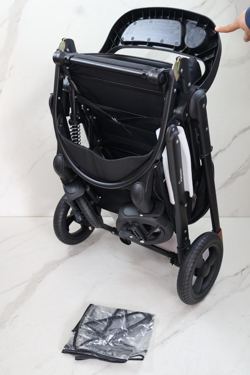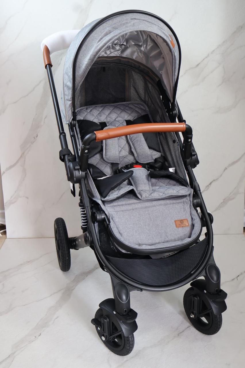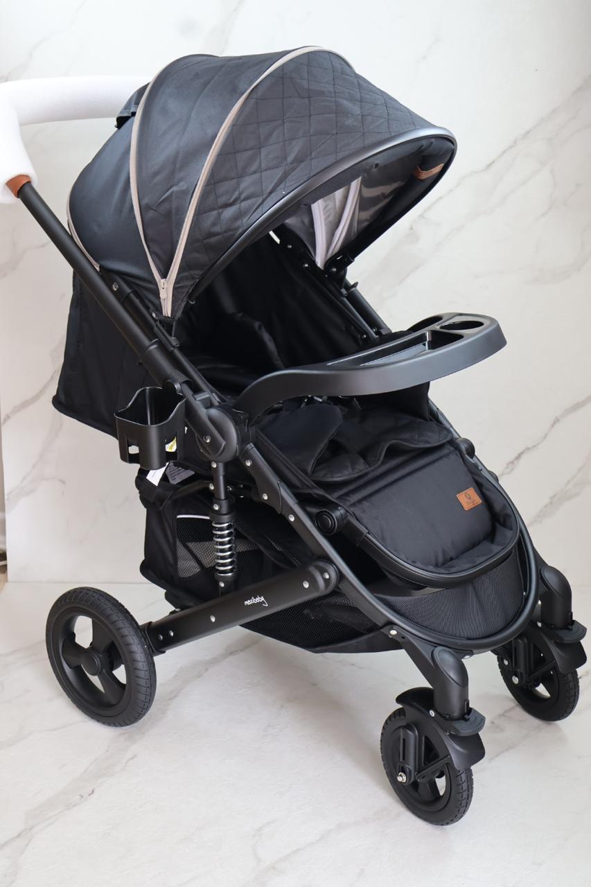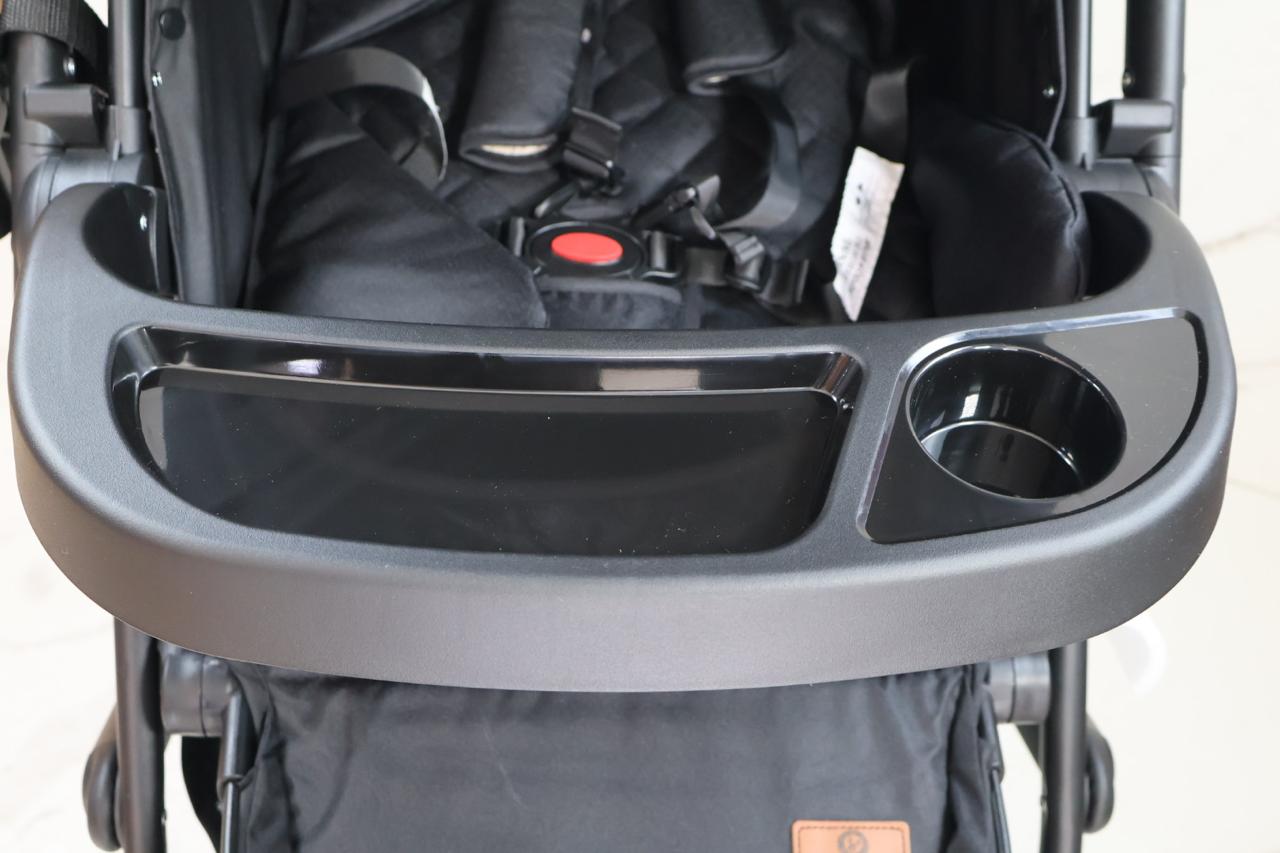 Coche con sistema de pliegue compacto y rápido, estructura en aluminio resistente, llanta en caucho, capacidad de 0 a 15 kg, edad promedio de 0m a 3 años, con manija reversible, acolchonados extras, cubrepiés, 5 puntos de seguridad, bandeja de comidas y amortiguación, incluye