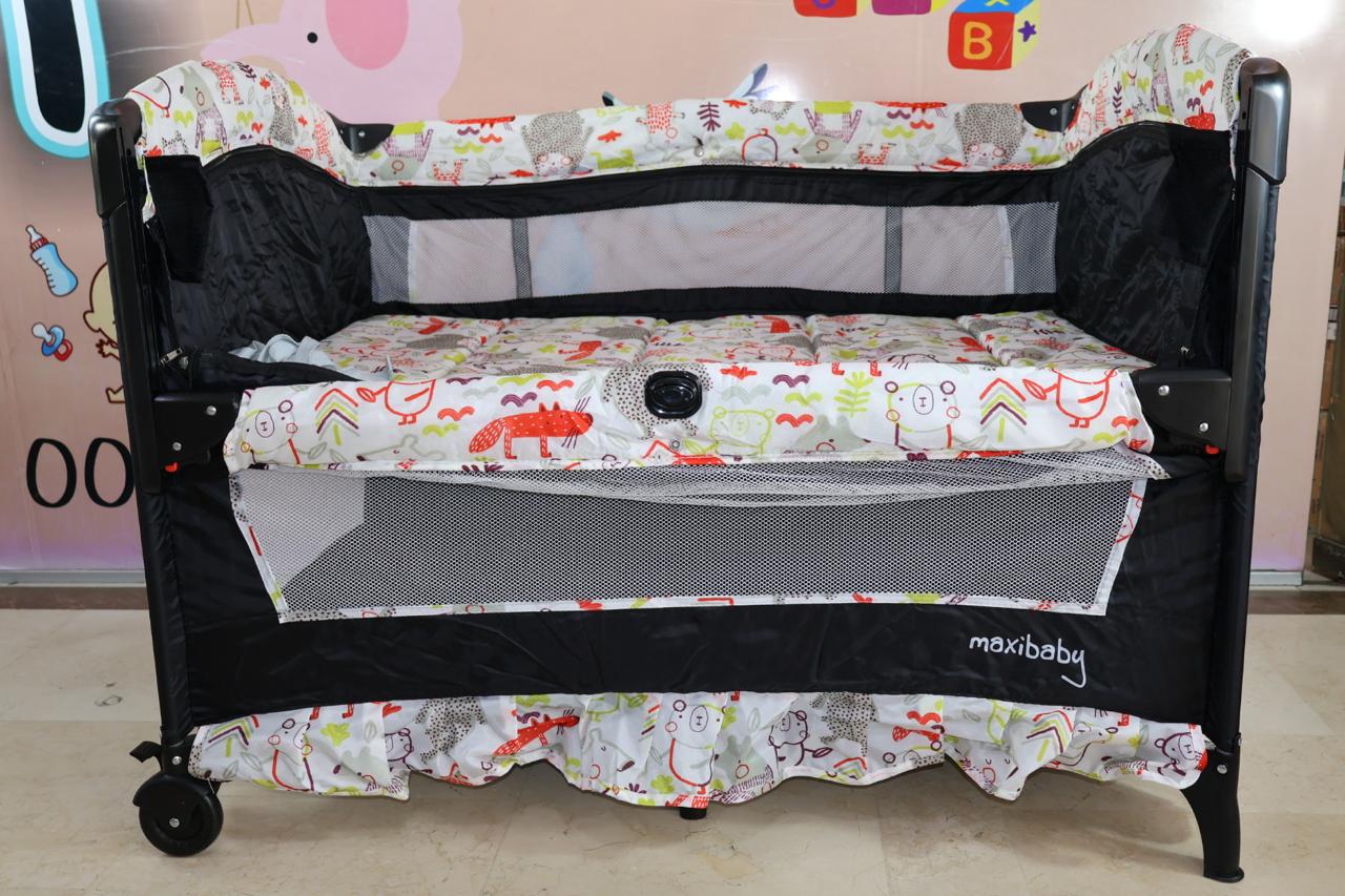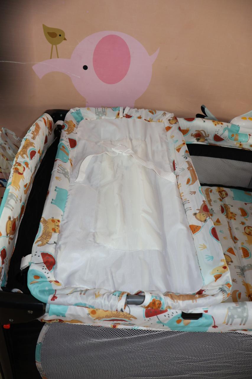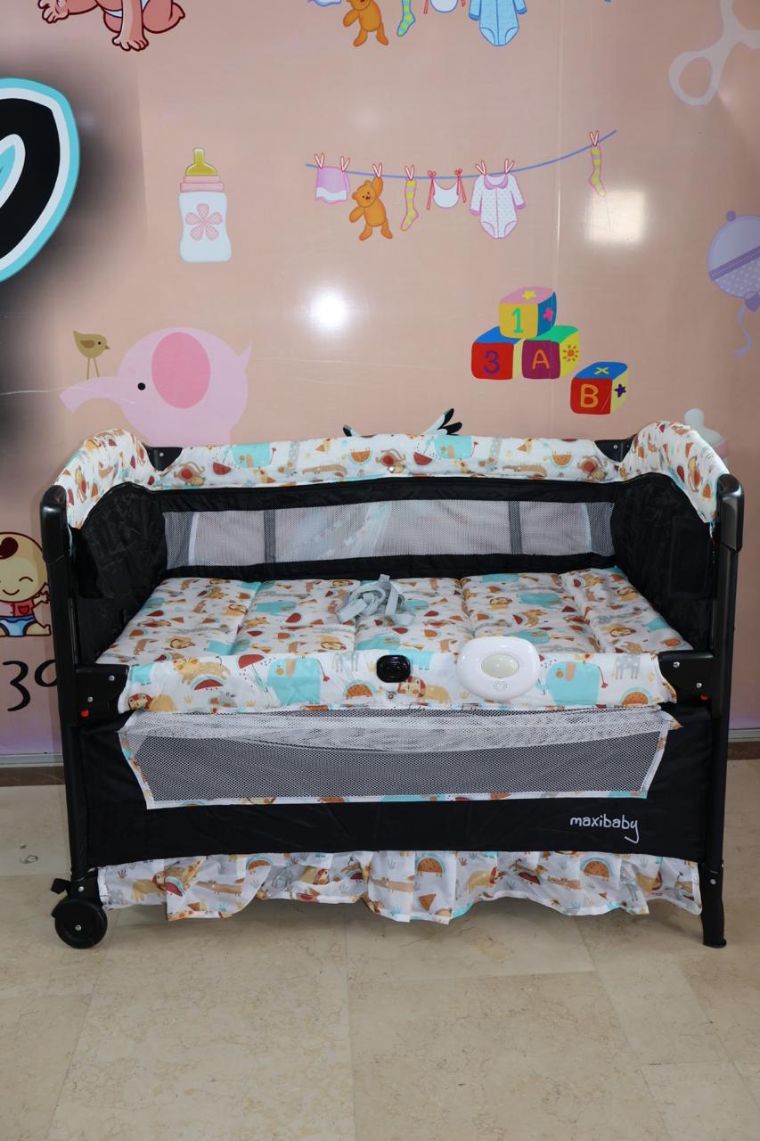 Cuna, corral, colecho monaco, medida de 70*110, cuenta con cambiador, toldillo redondo, monitor de vibración luces y sonido,mecedora, ruedas con freno, estuche para guardar, 3 ositos en felpa, mecedora