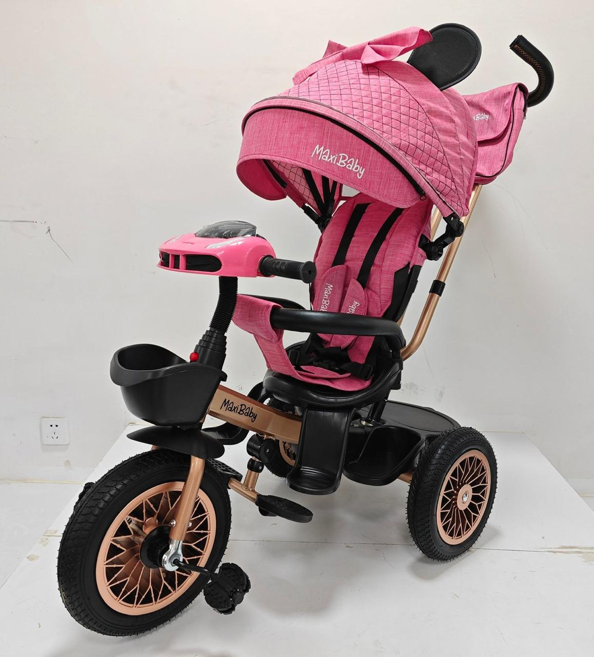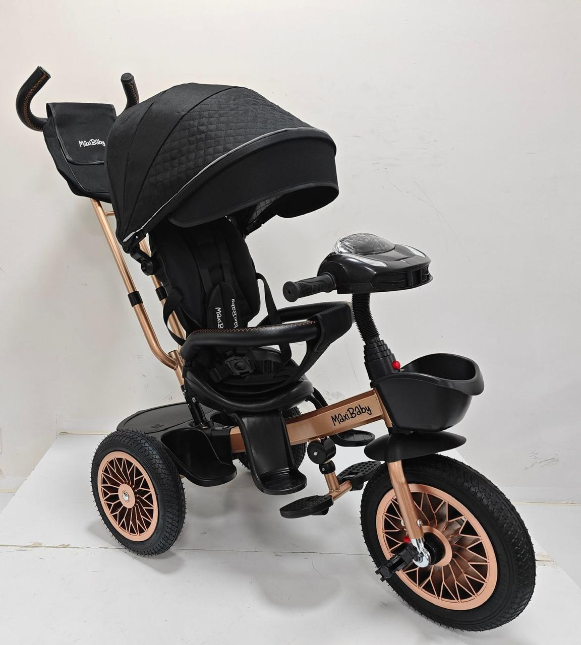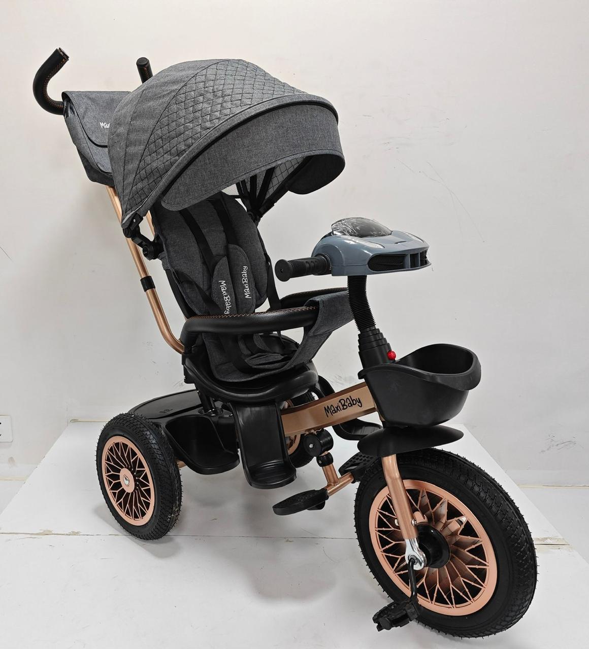 triciclo paseador con llanta en caucho, estructura en aluminio resistente, freno de palanca en llantas traseras, silla con reclinacion con giro de 180 grados, 5 puntos de seguridad y seguro lateral, cuenta con doble reposapies, capota expansible y guía con dirección, cuenta con luces led y bluethoo