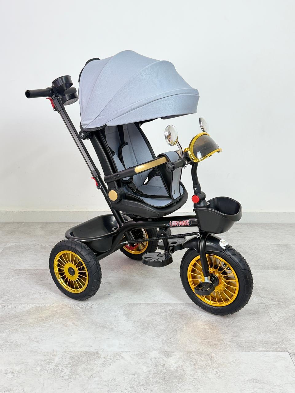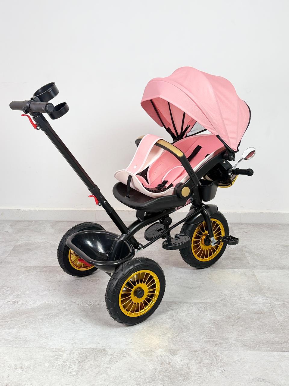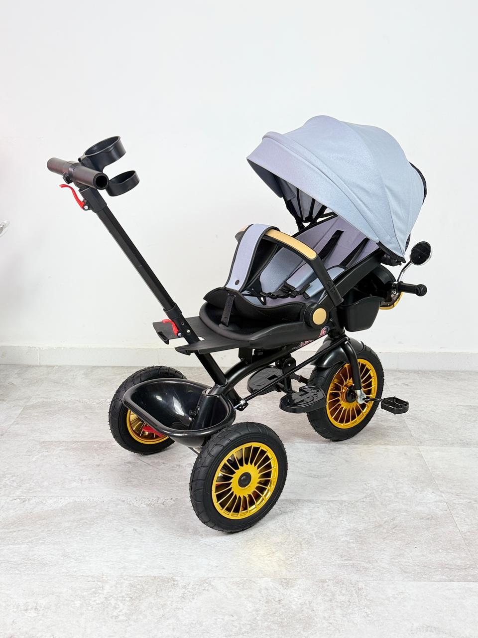 triciclo paseador con carpa, silla giratoria y declinable, cuenta con guía con dirección, rueda en caucho, lampara de luz con sonido, doble canasta, trasera y delantera, guía dirigible, porta bebidas, capota protectora, silla con espaldar declinable, y silla giratoria 360