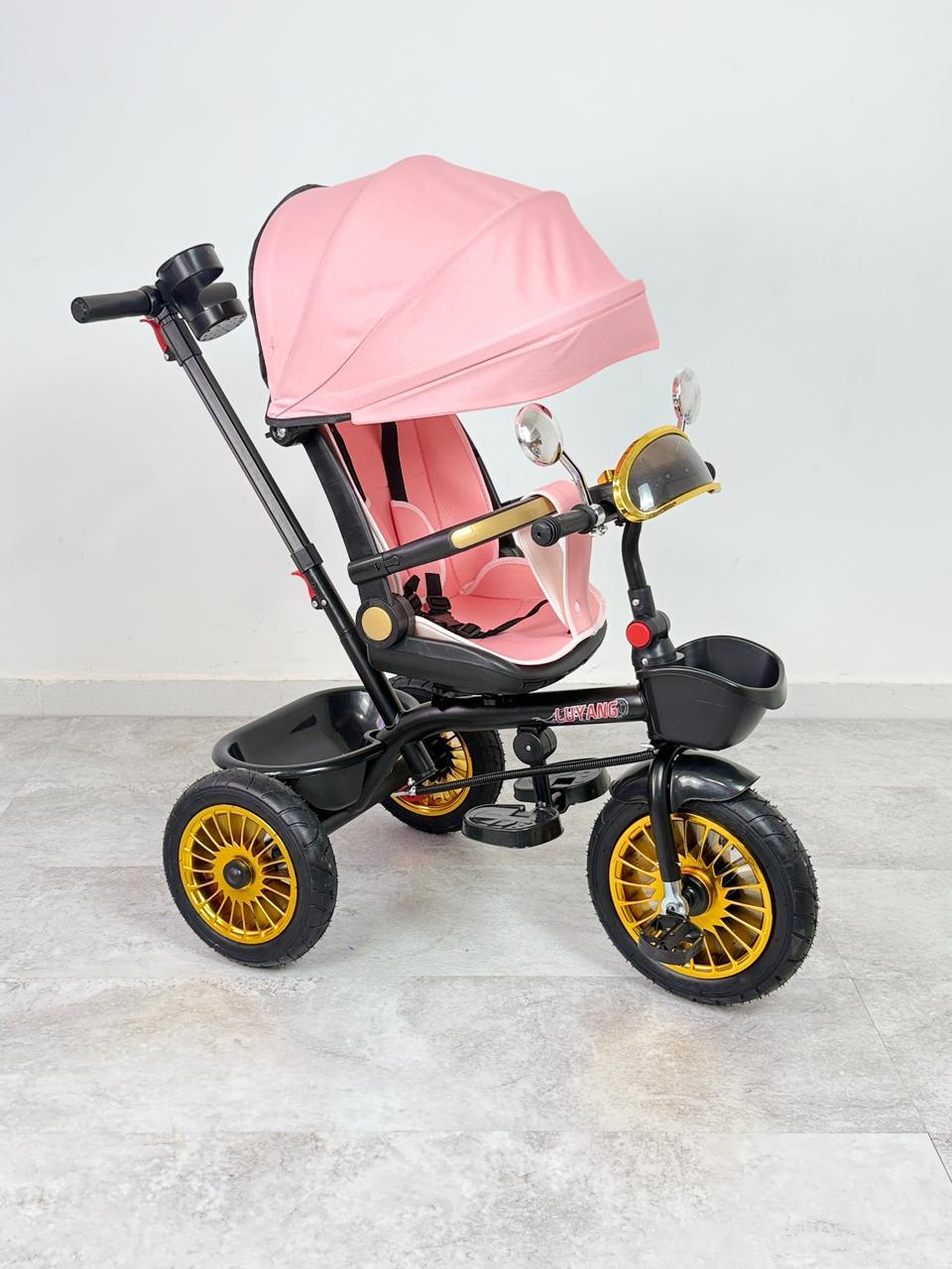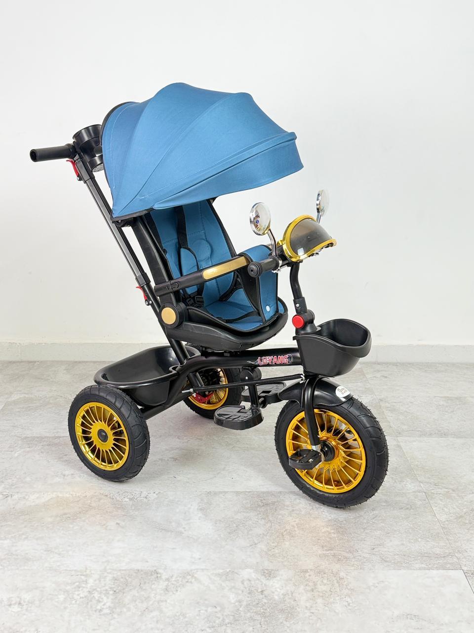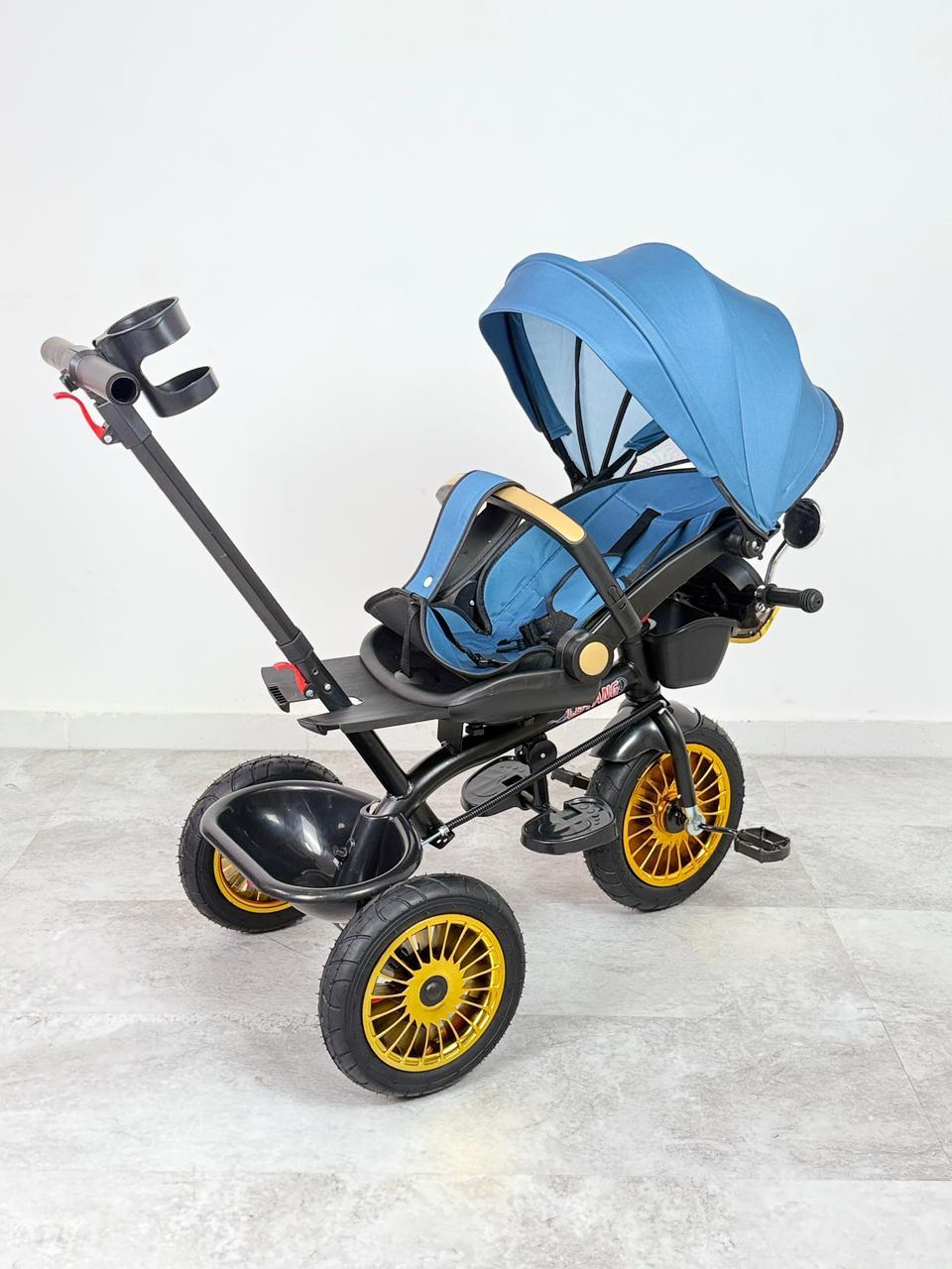triciclo paseador con carpa, silla giratoria y declinable, cuenta con guía con dirección, rueda en caucho, lampara de luz con sonido, doble canasta, trasera y delantera, guía dirigible, porta bebidas, capota protectora, silla con espaldar declinable, y silla giratoria 360