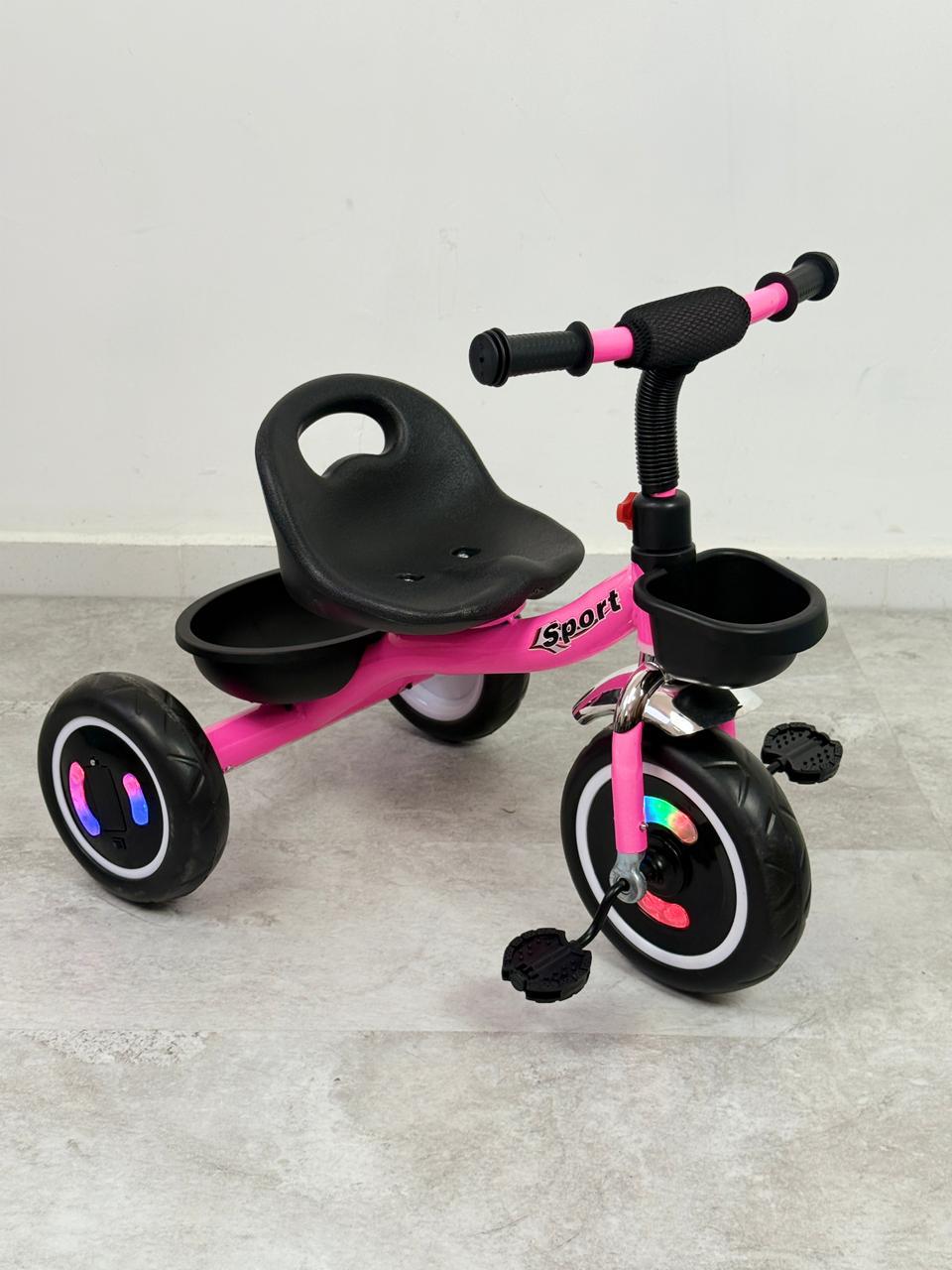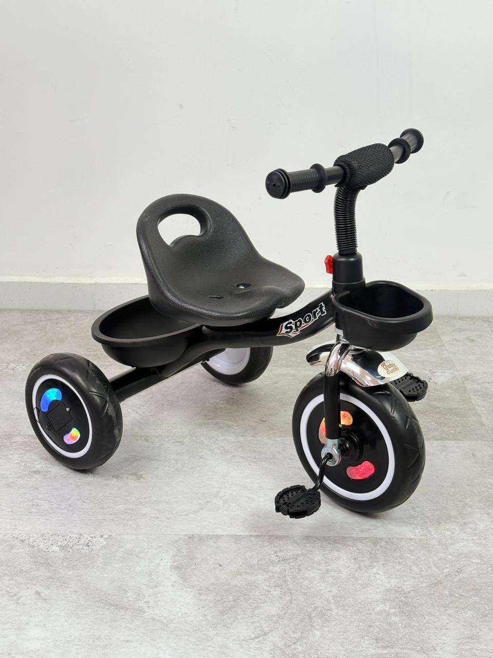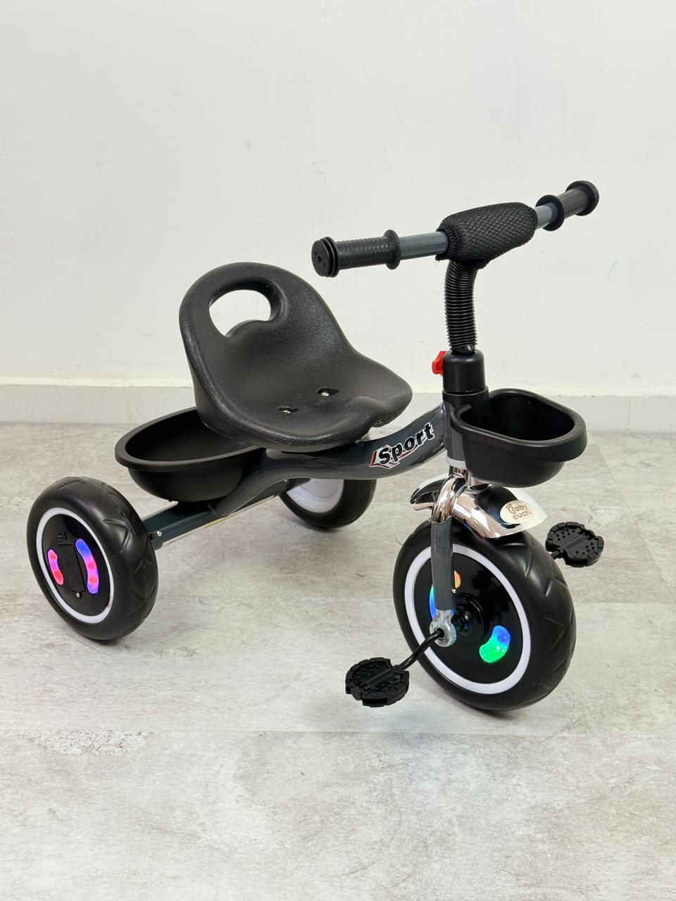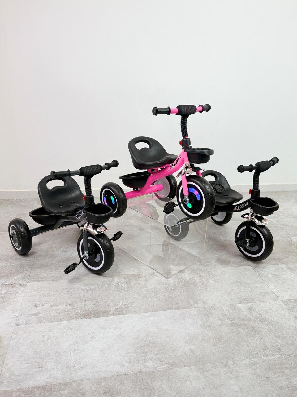 triciclo sport con llanta en goma, estructura en aluminio y luces en las llantas